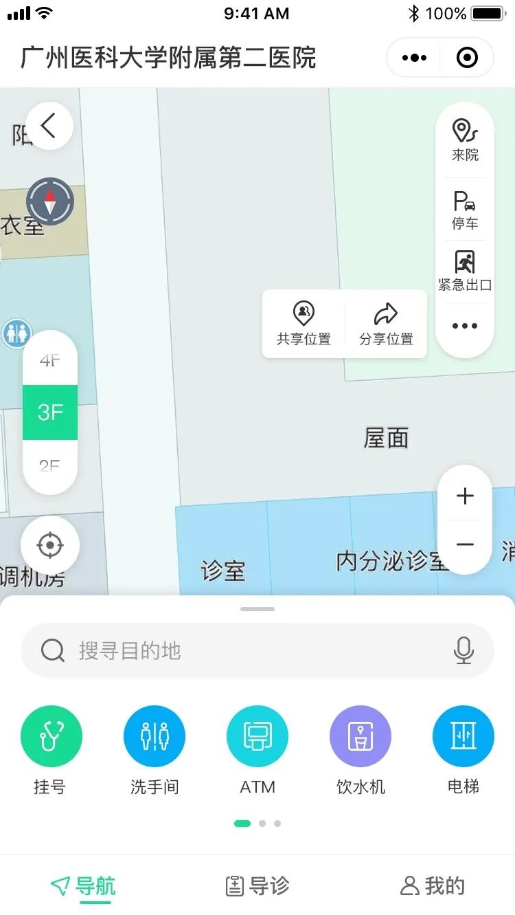 位置分享:亲友要来医院看望病人,病人将自己的病房位置通过导航系统的位置分享功能给微信好友,亲友来院后就可以从微信直接进入院内导航到达房间;